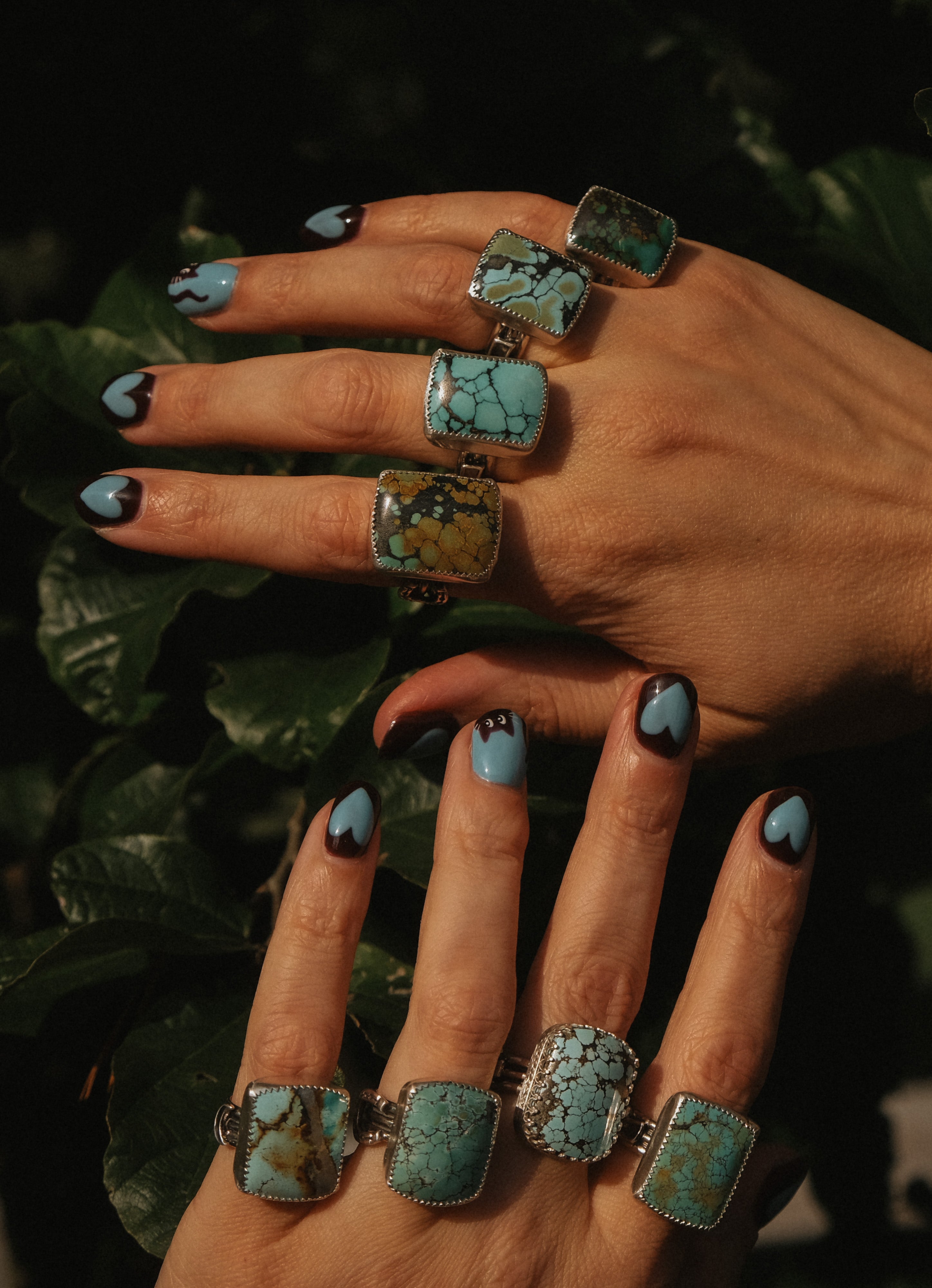 Handmade silver rings featuring bold stones and organic textures — each one made to stand out, never mass-produced. These are available to be finished in your size.
