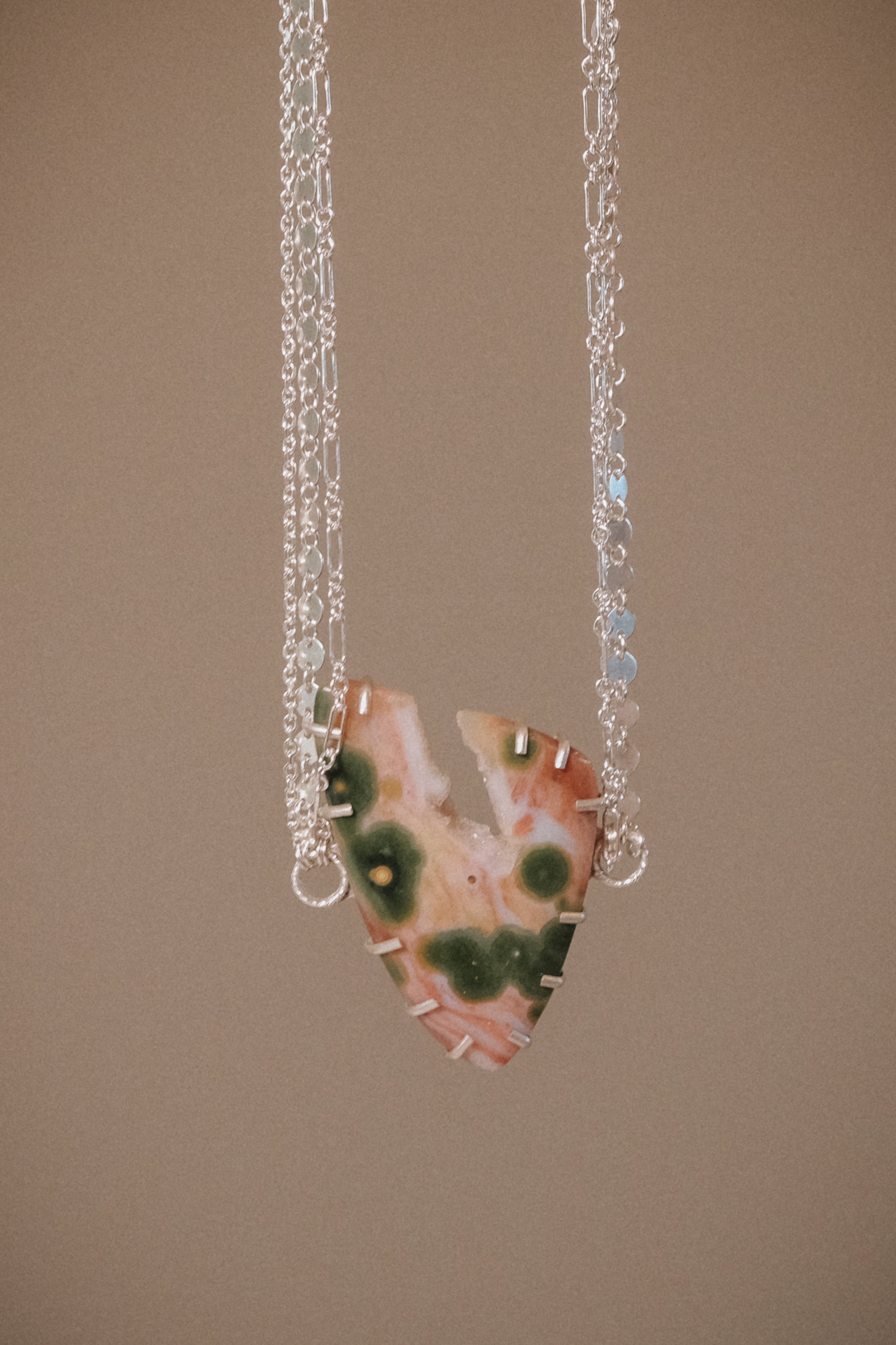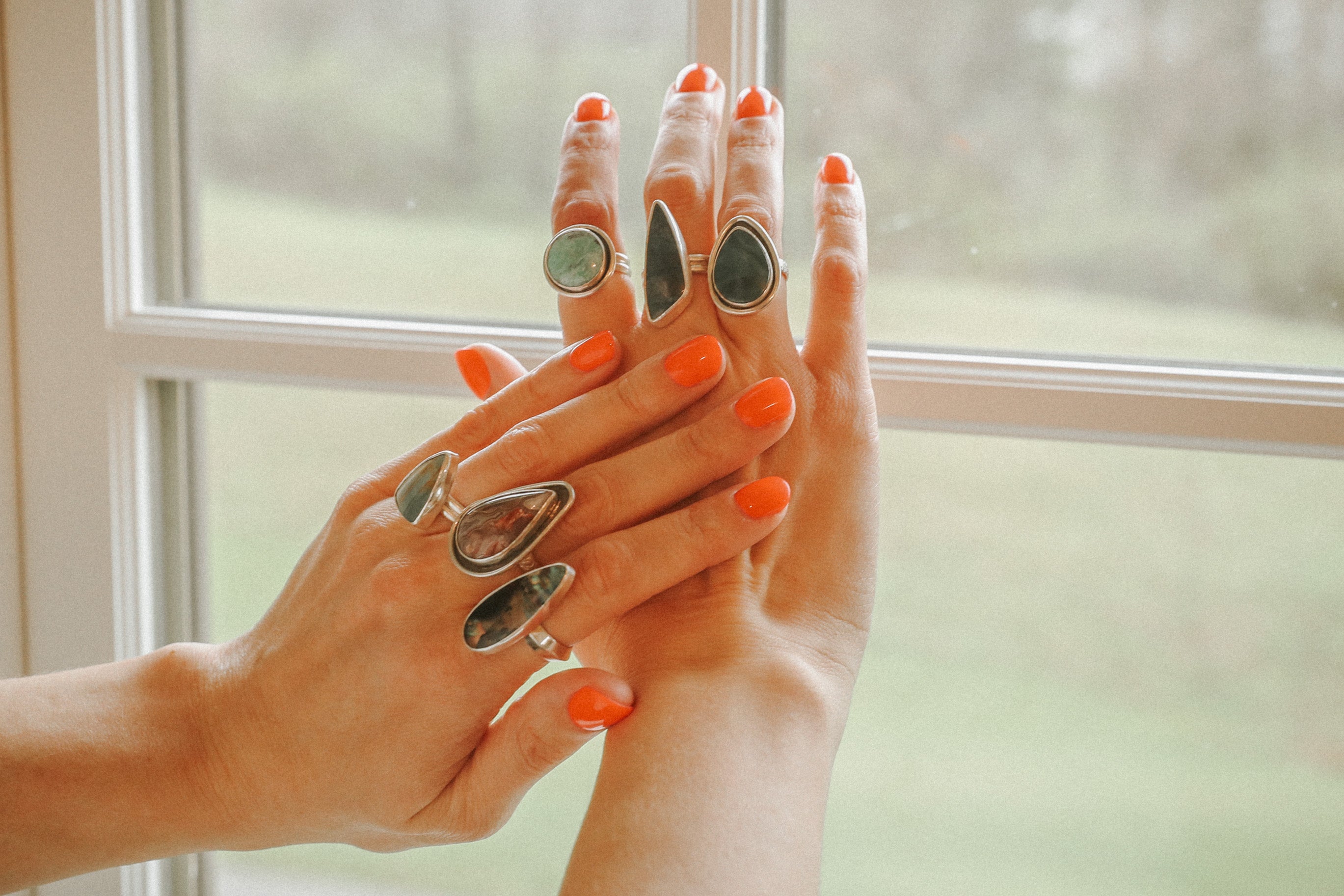 I work mostly in silver because I love how it evolves over time. I’m drawn to wild stones, unexpected textures, and colors that make you stop and stare. My work is inspired by nature, music, and the messiness of real life.